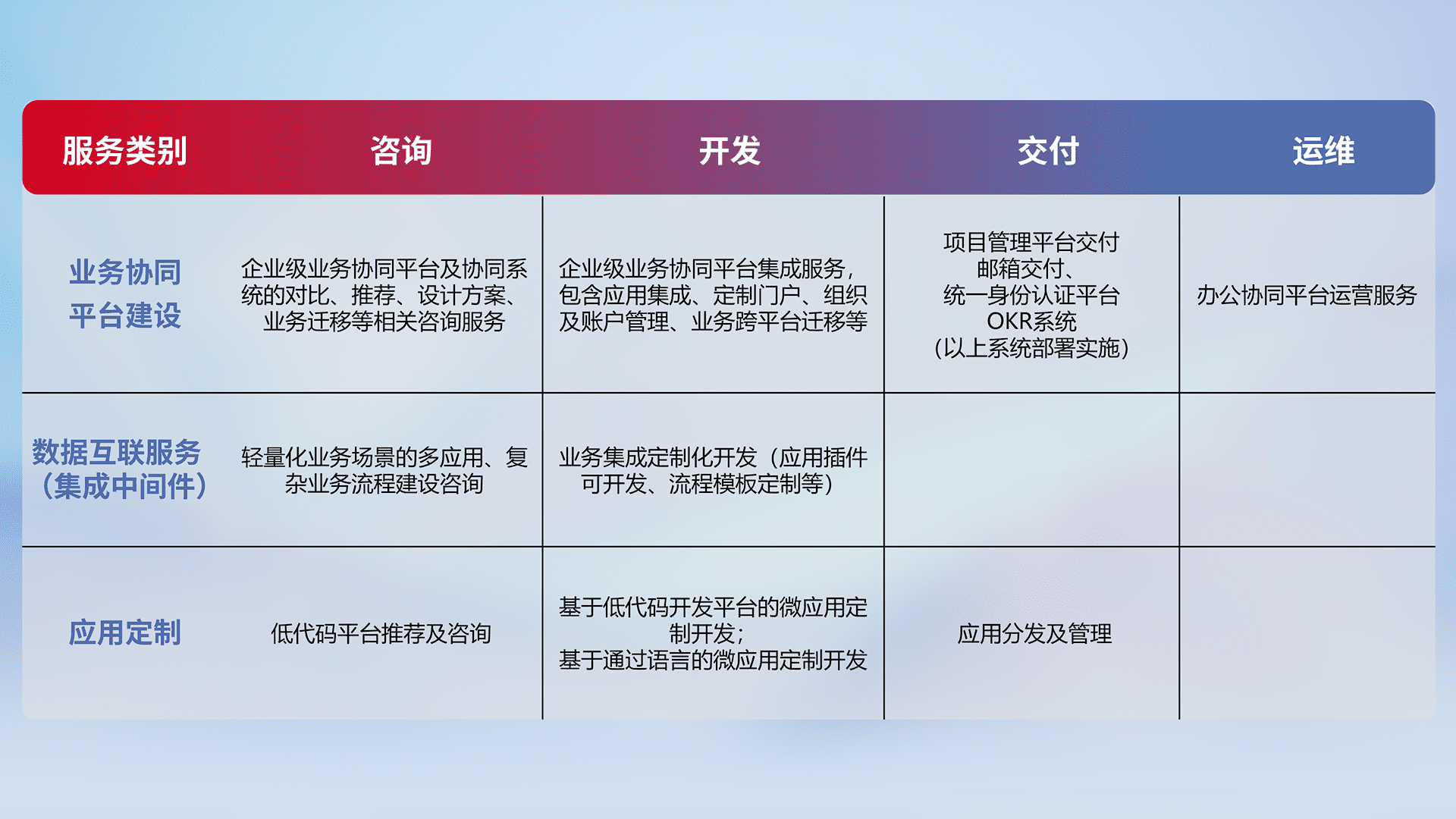 针对钉钉、、企微、、、、IDaas等平台级产品提供产品的规划、、、、方案、、、交付、、、定制化开发等服务,,,实现如统一协同办公、、、智能客户服务、、混合会议管理、、、、智能数据查询、、、等业务场景,,实现数字化转型。。。。