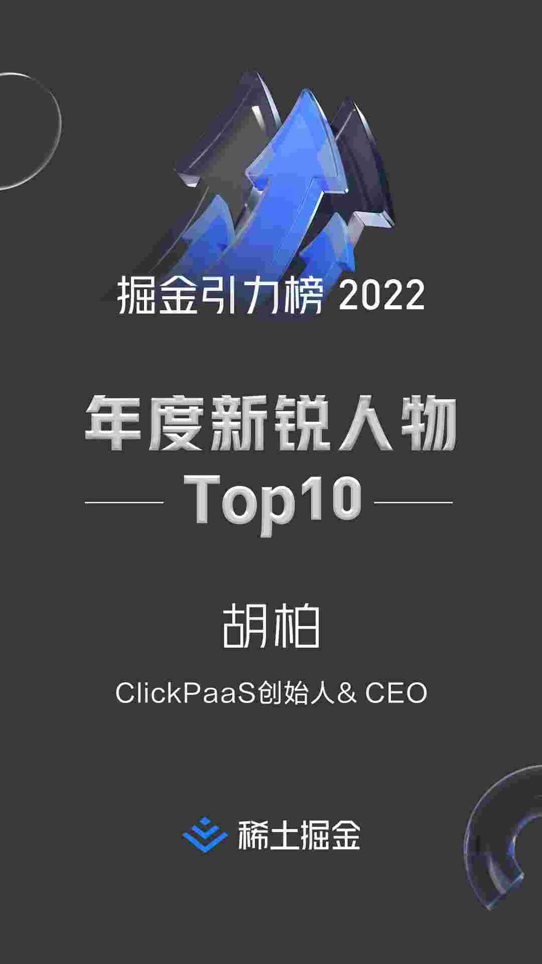 2022年1月6日,,,,,,,,,,稀土掘金社区第一届「掘金未来大会」成功举办,,,,会上发布了“2022 稀土掘金引力榜 年度新锐人物”榜单,,,,,,,,上海爱湃斯科技有限公司(简称华为钱包)创始人及CEO胡柏实力入选年度新锐人物TOP 10。。。。。。。