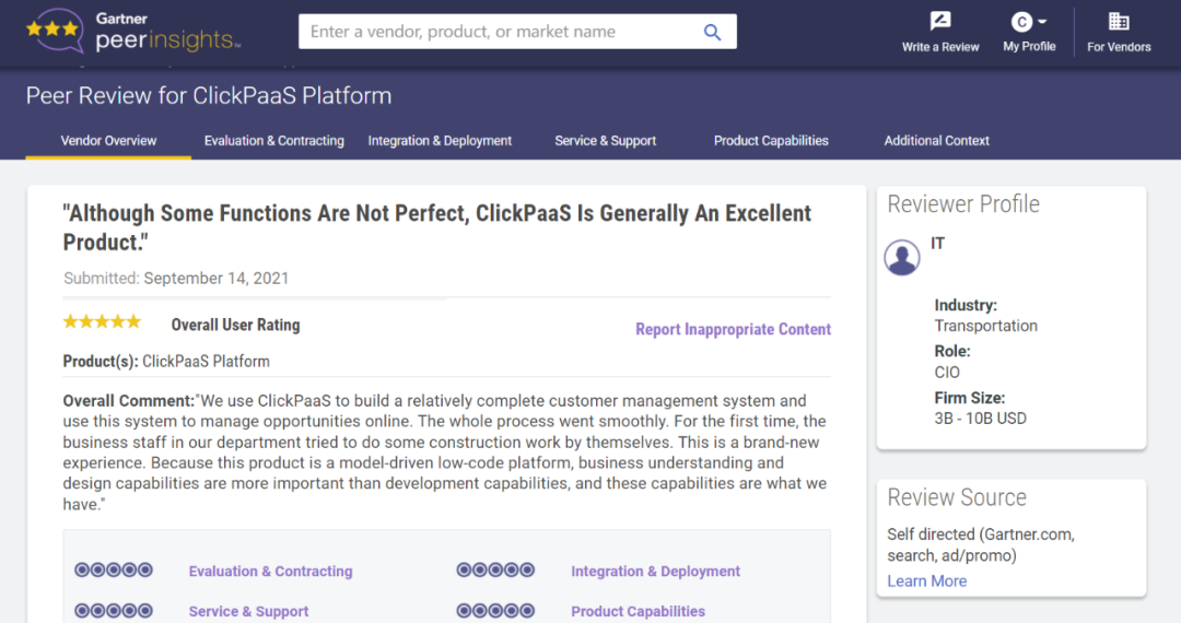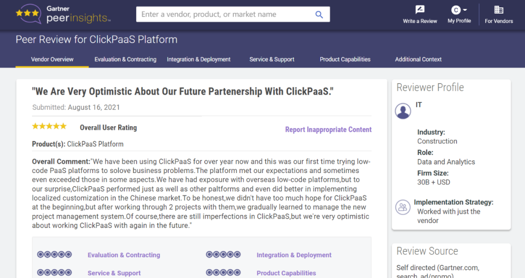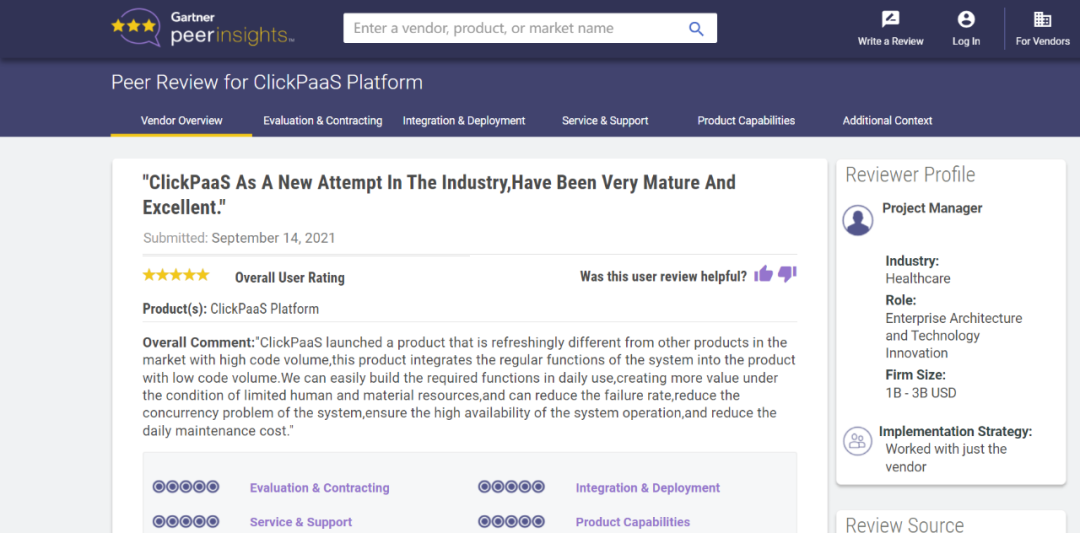 Tips::::::::【Peer Insights】——用户对企业IT产品和服务发布真实评价的平台。。。。。。。。。。。目前已有355个市场,,,,,,,,,,,,,,255,000条经过验证的评价。。。。。每一条评价Gartner会针对参评企业营收规模及参评人员信息做验证、、、、、、、、评价内容做多维核实。。。。。。