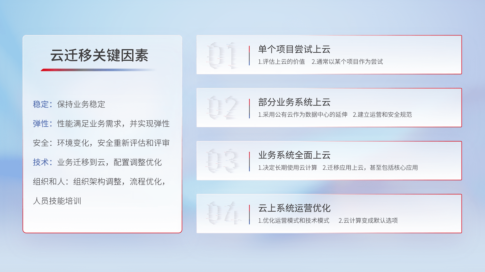 结合实际业务,,从规划设计、、、、云平台选型、、云原生改造、、、、数据迁移、、集成交付,,迁移全过程为客户识别最佳上云路径,,,,做好风险识别管理,,,设计网络架构、、、身份权限、、、、安全审计合规、、、、操作审计、、、、日志审计、、、、监控告警策略、、、、多站点容灾设计等,,,对云上基础设施进行整体规划,,,,提升IT治理水平,,,以满足弹性、、高可用、、、、高性能的需求。。。。