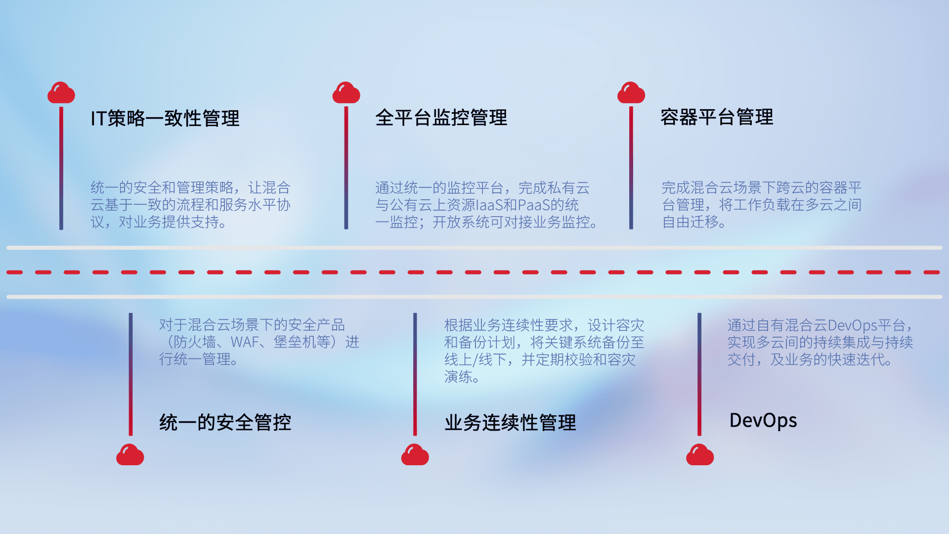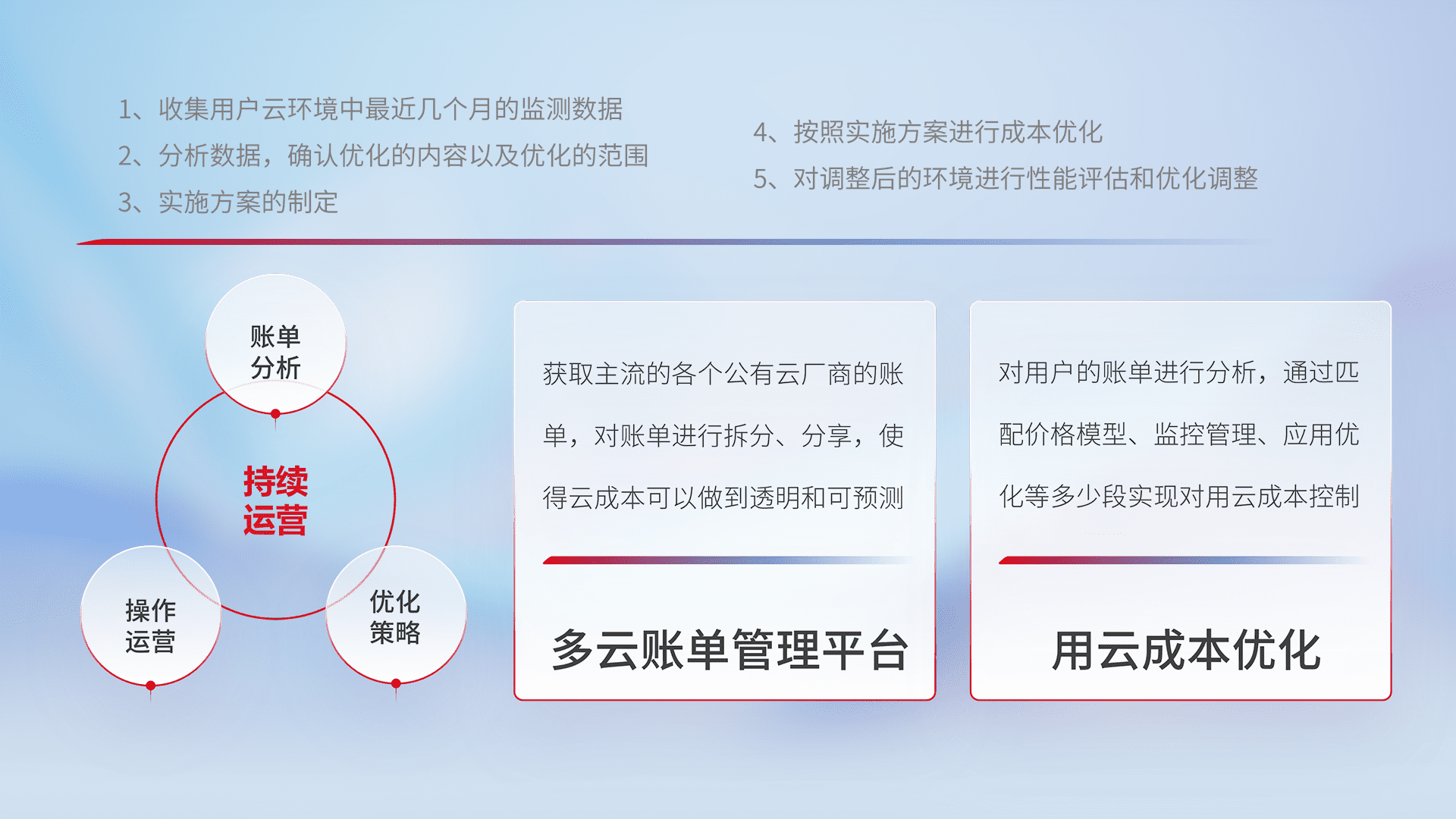 通过多云纳管,,以统一的资源数据模型把客户的云资源进行抽象和封装,,进而实现对多云资源的统一操作,,保障云资源管理的可靠性、、、、稳定性与可用性。。。量身定制化运维内容,,配置、、、开发运维、、补丁管理、、、、备份、、、、监控、、认证和访问管理、、、、审计和日常巡检等,,,,保障在用云过程中的可靠度,,,稳定度以及高可用率。。